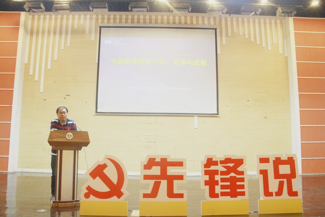 活动伊始,国家教育宏观政策研究院卢威老师为在座师生党员做“高等教育70年——变革与成就”主题讲座。卢威老师主要从我国高等教育事业发展成就、从体制改革政策看高等教育治理现代化以及新时代高等教育改革发展的方向定位三个方面讲述了新中国70年来高等教育的成就与发展。以非常翔实的数据向在座党员师生展示了高等教育规模、体系、质量等发面的变化,让大家切实地了解到高等教育鲜为人知的精彩时刻。