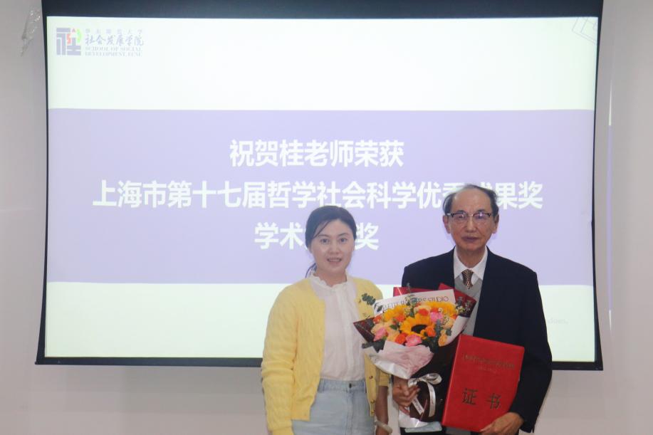 党委副书记兼副院长庞荣代表学院向人口所终身教授桂世勋赠送鲜花,热烈祝贺桂教授荣获上海市第十七届哲学社会科学最高奖项“学术贡献奖”。桂世勋教授是首位在人口学领域获此殊荣的学者。他是中国人口社会学、老年学及社会保障研究领域的奠基人之一,曾获得国家级“有突出贡献的中青年专家”“中华人口奖”“中国老年学杰出贡献奖”等重要荣誉,其学术成果为中国养老保障体系、老龄政策制定做出了卓越贡献。