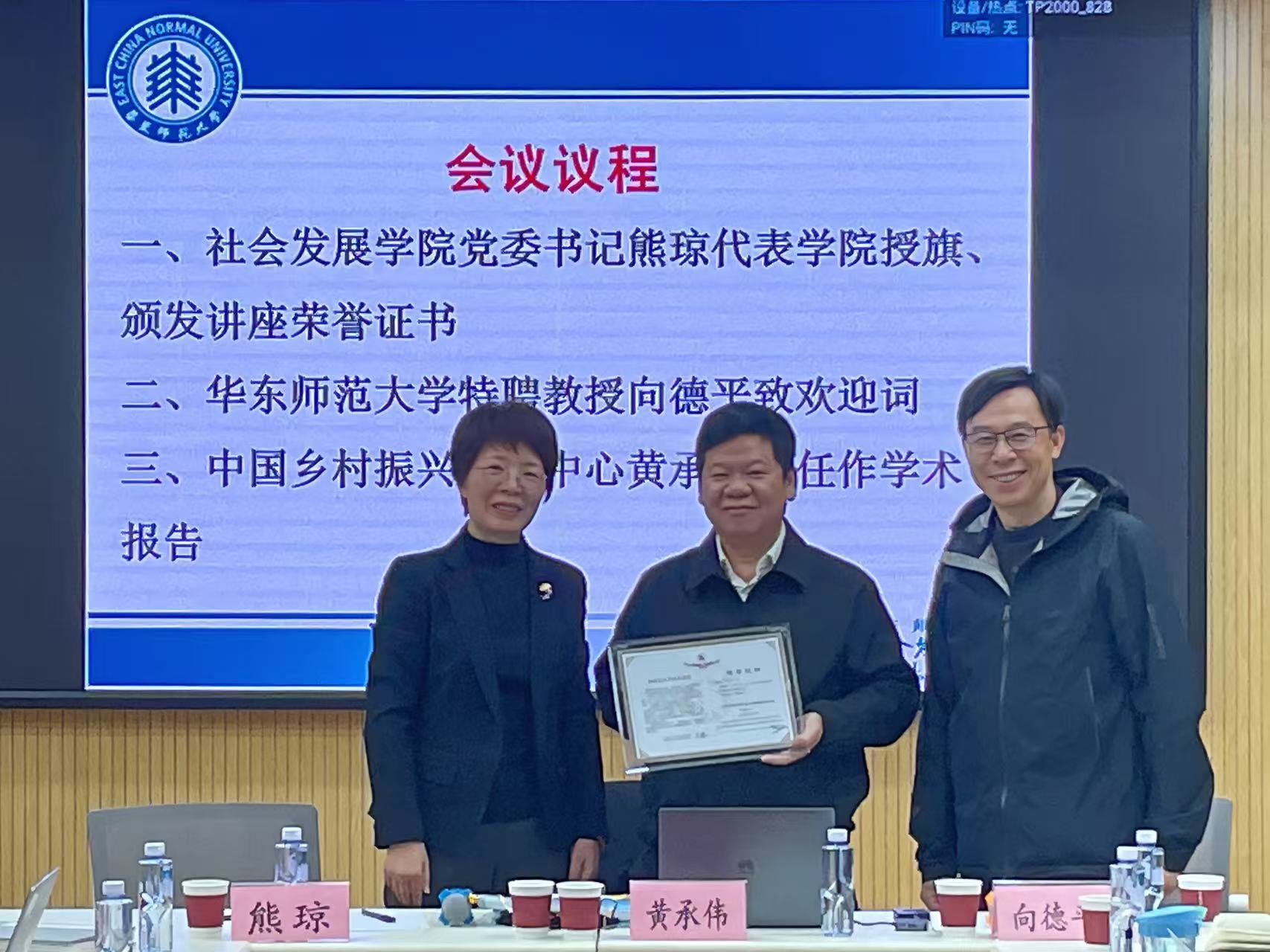 党委书记熊琼代表学院对黄承伟主任的到来表示热烈欢迎,并赠予荣誉证书及院旗。向德平教授也对黄承伟主任的到来表示欢迎,并向在场师生简要介绍了黄承伟主任的丰富履历和深远的学术影响。