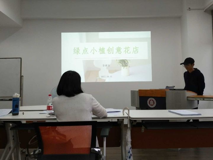 在第一部分里,答辩的同学们积极踊跃,构思新颖,主动展示着他们的发现和探索过程。比如,孙新友同学的“绿点小植创意花店”项目意在在校园开办一个租绿植的店,引发老师和同学们的畅想和讨论,这样正切入校园需求的创业计划赢得了一致好评,全场掌声雷动。