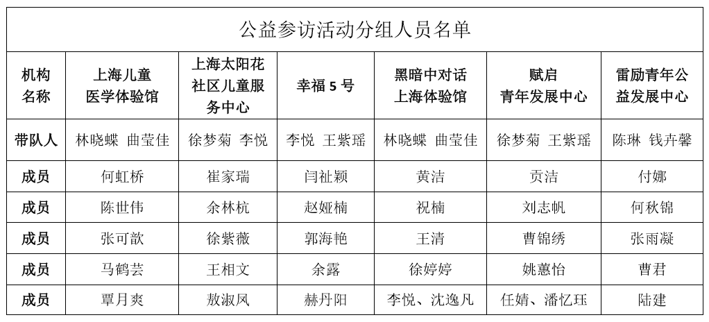 通过后期的统计与审核,依据学生的意愿与时间的先后性,六个参访机构的分组成员名单以及领队(下表)已出,另附上各参访机构群的二维码,请各位队员尽快对应扫码入群!