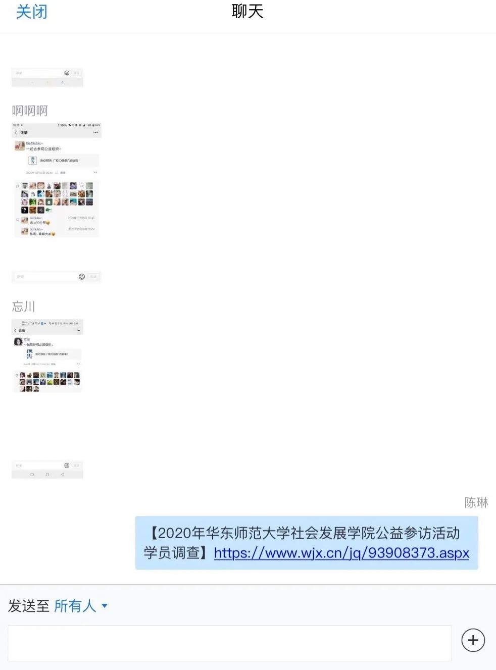 今年与往届不同,采用了线上转发朋友圈集赞的方式进行报名。在培训会正式开始前,报名成员们就陆续在对话框内发送朋友群集赞界面截图。最后,在主持人的讲解说明下,大家通过线上填写链接的方式选择参访机构志愿。
