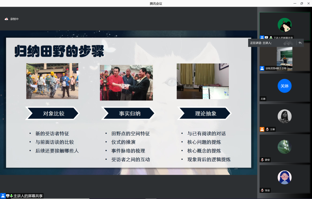 在本期科研训练营活动中,杨洋学姐与李安琪学姐结合自身的科研经历,向同学们分享田野调查与学术研究相关知识。相信同学们听完两位学姐的分享后收获满满,希望同学们通过本次课程学习,掌握到更多关于科研的基础知识与实用性技巧,并在以后的科研中将这些经验付诸于实践。