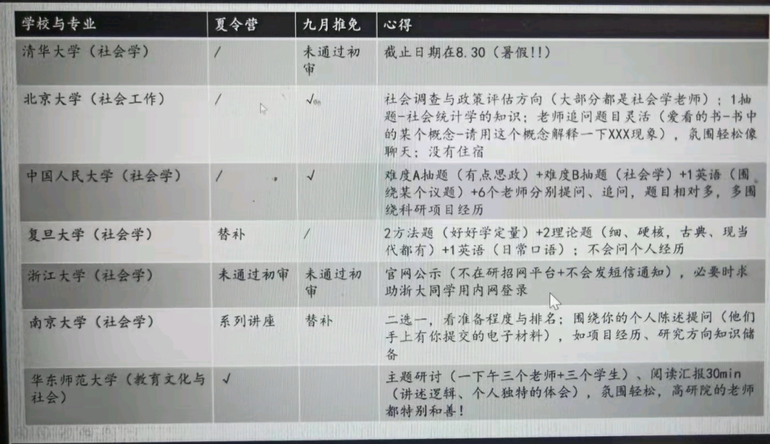 接下来,叶姝蝶学姐结合自身保研经历,详细介绍了保研的时间流程,即在5-6月准备保研所需材料,在7月中上旬参加夏令营,在9月初教育部会公布保研政策、确定保研名单,然后就可以准备九月中下旬的九推面试了。她还给我们分享了获取保研相关消息的信息渠道(关注保研岛等保研公众号)和保研需要准备的一些文书材料(获奖证书等),以及社会学专业的保研学校选择等内容。