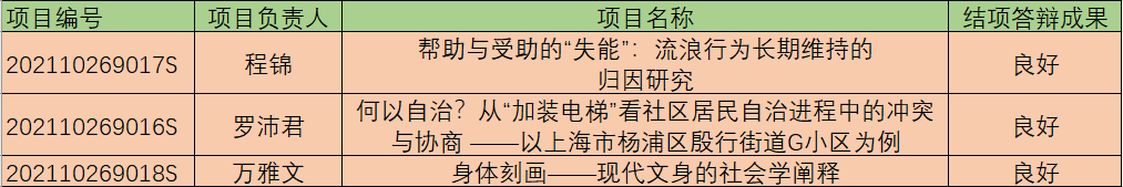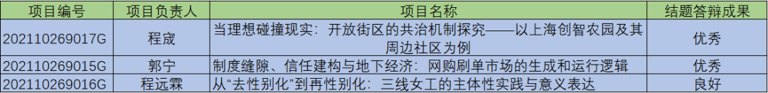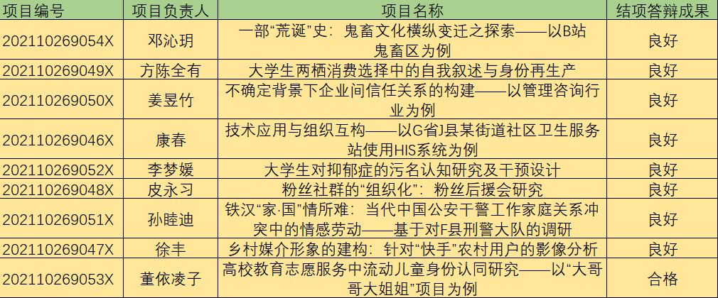 每位负责人都在规定时间内最大程度地展现项目研究成果:程宬同学的“当理想碰撞现实:开放街区的共治机制及实践逻辑”,体现了其对社区治理机制与实践效果的深刻反思;万雅文同学的“身体刻画:现代文身的社会学阐释”,以社会学的独特视角深入探究现代化进程下个体独特性的表达,体现了社会学的人文关怀;姜昱竹同学的“不确定背景下企业间信任关系的构建——以管理咨询行业为例”从社会学的视角出发,融入多学科思考,对企业信任的构建展开了深入的研讨;皮永习同学的“粉丝社群的组织化:粉丝后援会研究探讨粉丝经济与粉丝后援会组织化的问题”,研究并发现了多重关系网络下的多重角色;李梦媛同学的“大学生对抑郁症的污名认知研究与干预设计”,探究了产生污名认知的原因,并从社会学习理论出发提出了干预措施;郭宁同学的“制度缝隙、信任建构与地下经济:网购刷单市场的生成与运行逻辑”,讨论了网购刷单市场生成的制度缝隙和三类刷单组织信任建构的逻辑,带大家探索了刷单此类地下经济体制中的隐秘角落;程远霖同学的“从‘去性别化’到‘再性别化’:三线女工的主体性实践及意义表达”,从社会性别维度入手探讨三线建设这一历史背景下的性别建构,探求女工主体性的实践和意义表达;程锦同学的“‘帮助与受助的失能’:流浪行为长期维持的归因研究”,探讨关于了流浪者社会帮助的缺乏,流浪者家庭支持的缺乏;罗沛君同学的“何以自治?从‘加装电梯’看社区居民自治进程中的冲突与协商——以上海市杨浦区殷行街道G小区为例”,体现了其对基层自治和民生问题的深入思考。