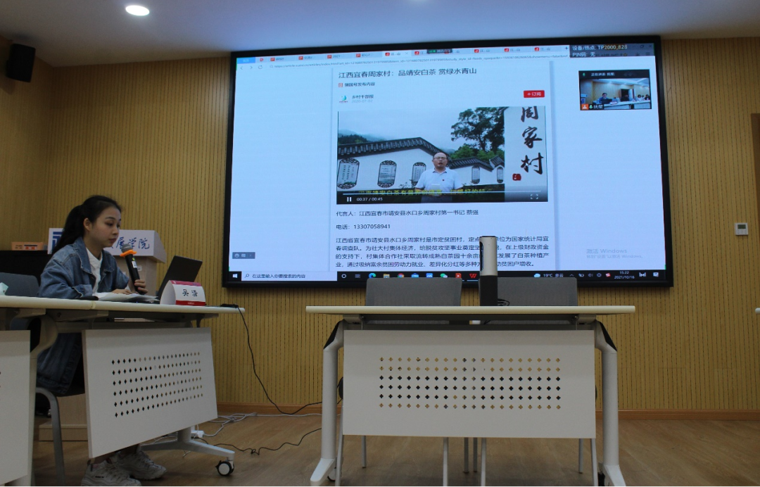 吴潇学姐是江西省委组织部选调生,就职于宜春市人力资源和社会保障局,现挂职于靖安县水口乡水口村,她以“初心不改 做扎根基层的奋斗者”为题,分享了自己的基层工作经历。吴潇学姐首先谈到,成为一名选调生,既是出于家国情怀,也是被钱校长“去到大有可为的地方”,被自己的乡土情结激励着。接着,学姐也从求职的角度分享了选调生的报考经验,提醒大家从自身性格、报考条件等方面了解自己是否适合成为一名选调生,并注意地域的选择。然后,学姐重点分享了自己的基层工作经历,包括扶贫工作、抗疫宣传、云辅导项目、妇女儿童之家与农家书屋的创建等工作。学姐把基层工作比作辅导员的工作,“上面千条线,下面一根针”,繁琐不易,但意义重大。最后,学姐也提出了三点工作感悟,一是要勤学善思,深入调查研究;二是要用心用情,做好群众工作;三是要提升能力,锤炼过硬本领。