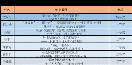 本次论坛我院共有7篇本科生论文参加答辩,分别是皮永习组的《变化的“他者”与不变的建构——穿青人族群认同探析》、何太皓的《“强政府”与“弱社区”:疫情期间社区自主性的悬置与归因——基于四川省L市G社区的实证调查》、程宬组的《家庭“抗疫力”测评量表的编制与检验——疫情治理的一种工具性抓手》、徐丰的《乡村教师的公共性为何衰退?——以职业自主性为中心的考察》、梁梦婷组的《“偏心”的教师:家庭背景、绩效体系与选择性重视》、蒋昀育组的《社会网络重建及其情感回馈:一项城市中产退休女性艺术参与的研究》和叶姝蝶的《道德个体与社会秩序——论“人人为己”的自在合理性》。