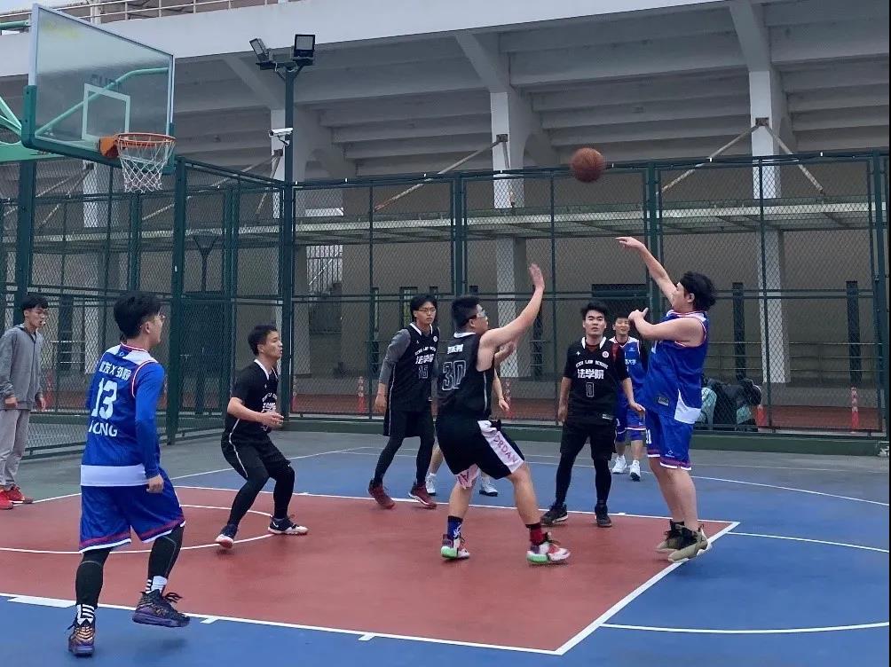 比赛正式开始,我方队员便主动出击,以矫健熟练的动作迅速传球, 直逼篮板,率先得分。不到十分钟,双方的分便为4:1。但是法学院选手也不甘示弱, 抵死防守,比赛相当激烈。我方10号选手一个漂亮的三分球便拉开了双方比分差距,第一节比赛结束,双方比分为9:5。