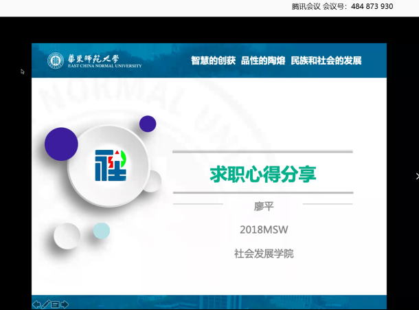 孟宪承书院的一名辅导员。她结合个人在本科与研究生阶段的实践经历,主要围绕辅导员是什么、辅导员职业本身、个人择业的思索、高校辅导员/行政岗的求职进行讲解。学姐表示自己的求职方向虽然很明确,即体制内的工作,但是一直都在探索、尝试。学姐也强调未来规划要趁早、放大自身的学科优势,展现社发人的自信、干一行爱一行,不要抱着图轻松的心态对待任何一份工作。