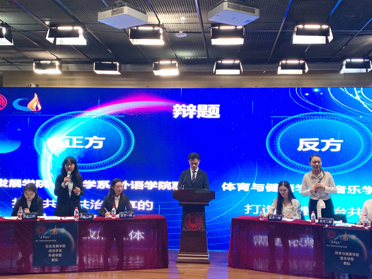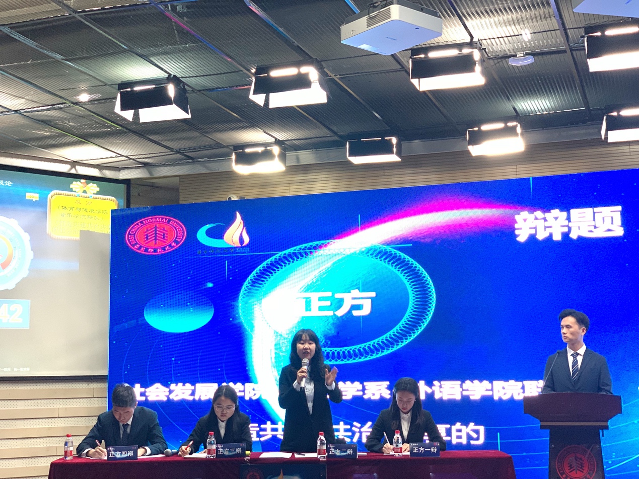 ·政治学院·外语学院联队为正方,而反方为音乐学院·体育与健康学院联队。我方联队抓住“政府或社会哪个主体更不可替代”这一标准,紧紧围绕政府更有责任、更有能力提供基本公共服务,进行更好治理以及政府是协调者、指挥者,可提供高质量、公平的服务,更有效率配置资源,总揽大局两个方面开展论述。而反方则从社会主体可提供更加专业的服务以及社会主体是真正落实的力量两个角度切入。经过开篇立论、质询、举例驳论、对辩、盘问、盘问小结和自由辩等环节后,整场辩论赛接近尾声,最后双方四辩分别进行总结陈词,更是赢得阵阵掌声。辩论结束后,三位评委老师离席商议比赛结果。与此同时,台上辩手的沉着冷静,唇枪舌战更是感染了台下的各位观众,积极向台上辩手提问,交流不同的思考和想法。