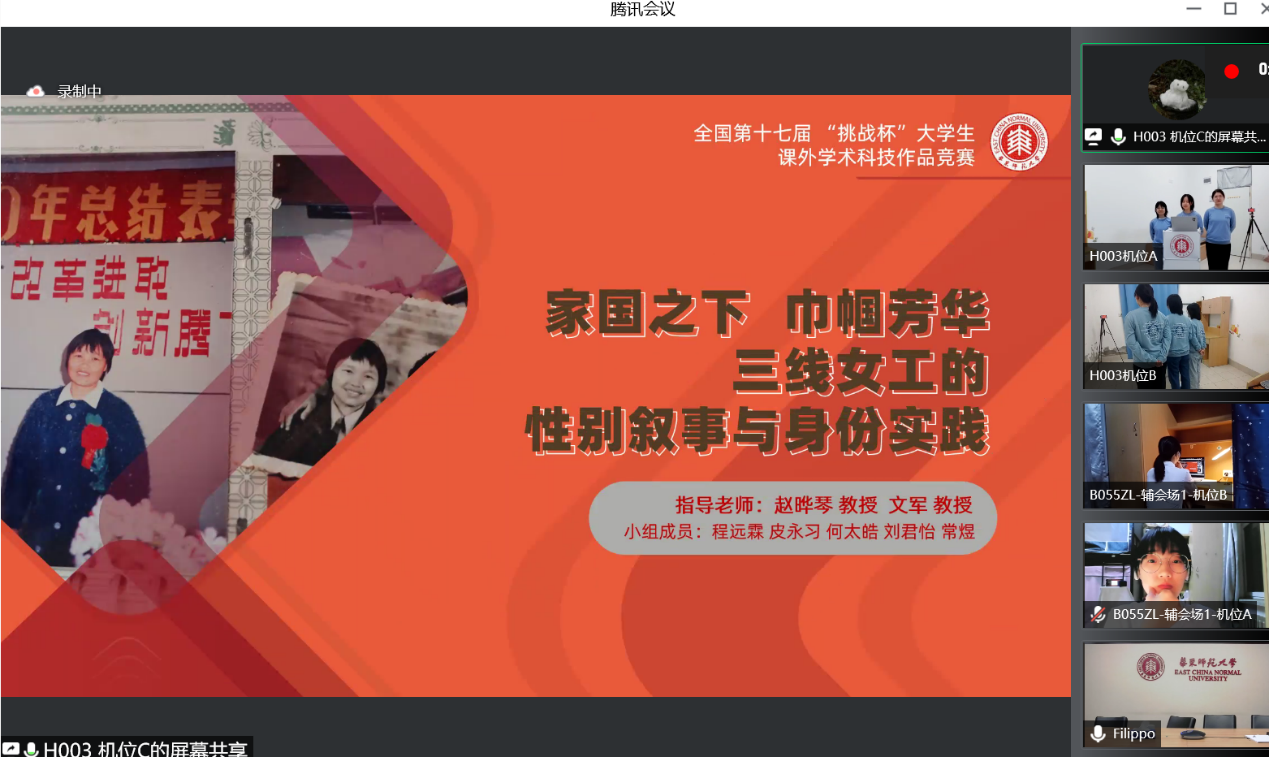 我院选送的社会调查报告《家国之下,巾帼芳华:三线女工的性别叙事与身份实践》由社会学系本科生程远霖、皮永习、何太皓、刘君怡和常煜共同完成,指导老师为赵晔琴教授和文军教授。团队曾在去年5月荣获上海市“特等奖”。经过本次线上答辩和评审,该项目荣获全国第十七届“挑战杯”大学生课外学术科技作品竞赛一等奖。