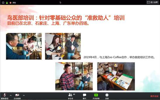 鸟医部在2017年12月至2019年12月期间,与全国救助伙伴合作,受理通过电话热线求助电话及各地护鸟志愿者的求助,与全国救助伙伴合作,总计接诊病例490余例,涵盖全国除西藏、香港外的各个省市,救助多只国家一、二级保护动物。此外,鸟医部积极开展针对零基础公众的“准救助人”培训,并以“让每一位学员都学会”为教学标准。目前,培训会已在北京、石家庄、上海、广东举办四场,取得了良好的效果。