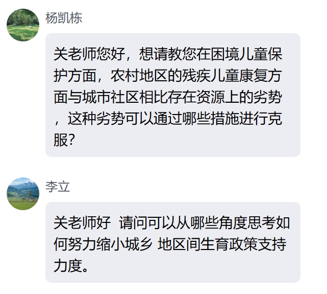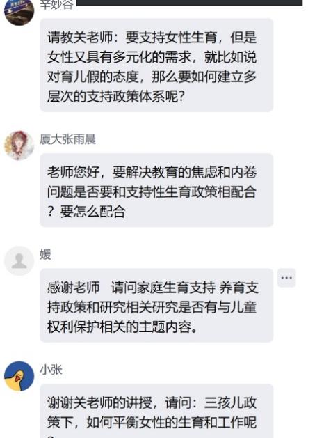 最后,关教授讲解完毕后,同学们纷纷通过会议聊天框向关教授提问,十分踊跃,关教授也耐心回答大家的问题,对生育支持型社会政策中的城乡差别、女性权益的维护等议题做了拓展。