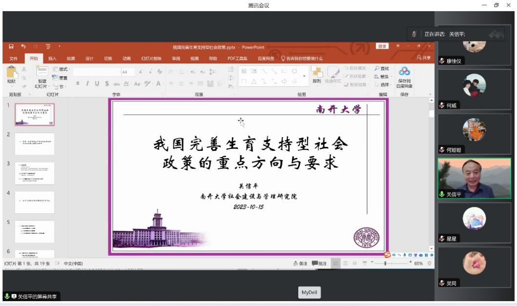 社会工作系承办的知名学者学术讲座(第36场)暨沪江名家讲坛(第23讲)通过腾讯会议在线上成功举办。本次讲坛非常荣幸地邀请到了南开大学社会建设与管理研究院院长关信平教授,为大家分享《我国完善生育支持型社会政策的重点方向与要求》主题讲座。本次讲座由社会工作系副主任何姗姗副教授主持,共有三百余名来自全国不同高校的老师和同学一同参与。
