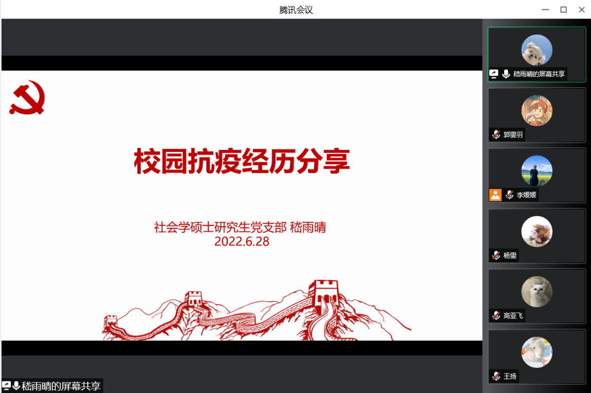 社会学系硕士研究生党支部书记嵇雨晴分享了其作为学生楼层长志愿服务经历,并对支部党员、入党积极分子参与志愿服务情况作出汇报。在封控期间,嵇雨晴担任了研究生公寓九号楼一层的学生层长,积极参与到了片区和楼栋的信息传达、三餐发放、核酸组织、物资发放等工作中。社会学系硕士研究生党支部24名党员和入党积极分子也加入到志愿者队伍中,用自己的现实行动为学校疫情防控贡献力量,充分发挥了模范带头作用,彰显了新时代学生的青春风貌和责任担当。