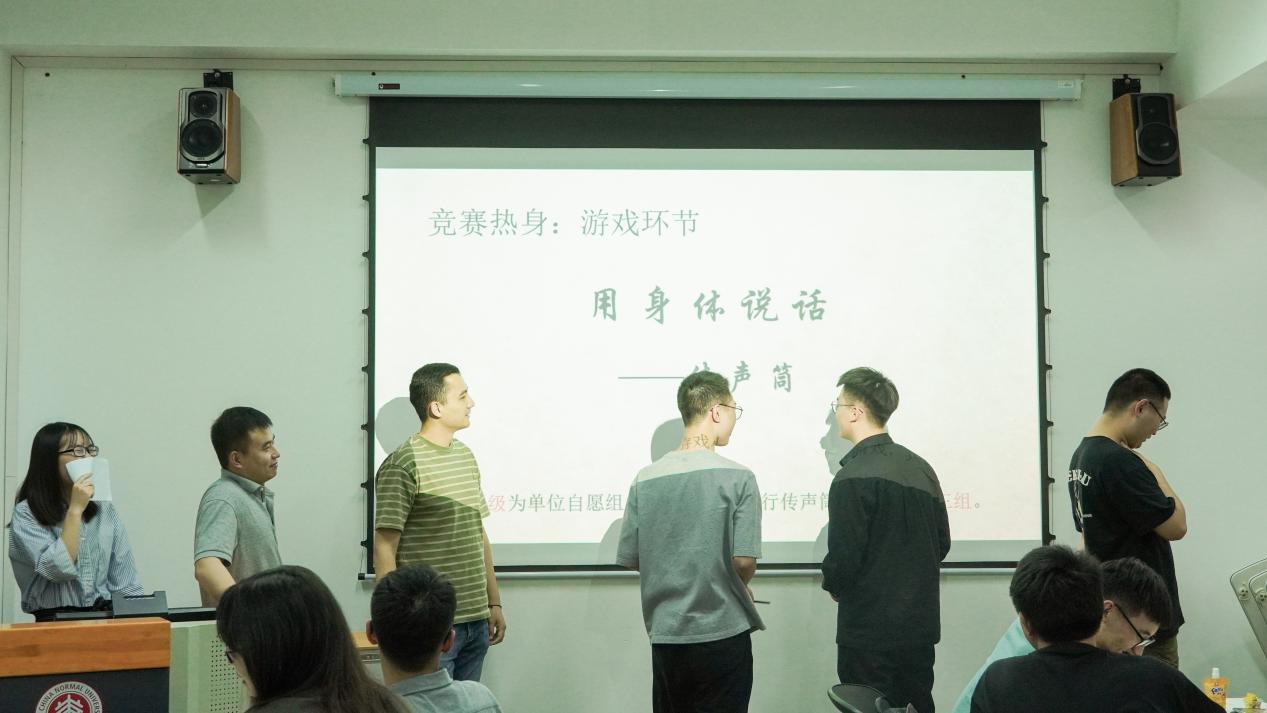 活动伊始,支部成员根据抓阄结果,随机分组并入座。主持人根据活动计划,在竞赛开始前以年级为单位组织开展了暖场游戏——“传声筒:用身体说话”。2020级、2019级和2018级的党员分别抽到了“干饭人”、“你在教我做事”、“拍毕业照”等词语,团队成员利用夸张的身体动作生动地表达了上述语句,过程跌宕起伏,现场气氛瞬间欢快了起来。