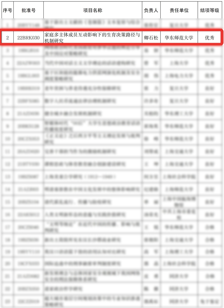 近日,全国哲学社会科学工作办公室公布了2024年7月国家社科基金年度项目、青年项目和西部项目的结项情况。我院人口研究所所长卿石松教授主持的国家社科基金一般项目《家庭多主体成员互动影响下的生育决策路径与机制研究》结项成果荣获“优秀”等级(结项证书号:20242618)。