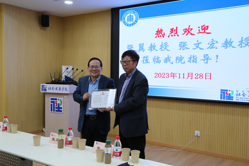 向张文宏教授赠送学院纪念锦旗与知名学者讲座证书。