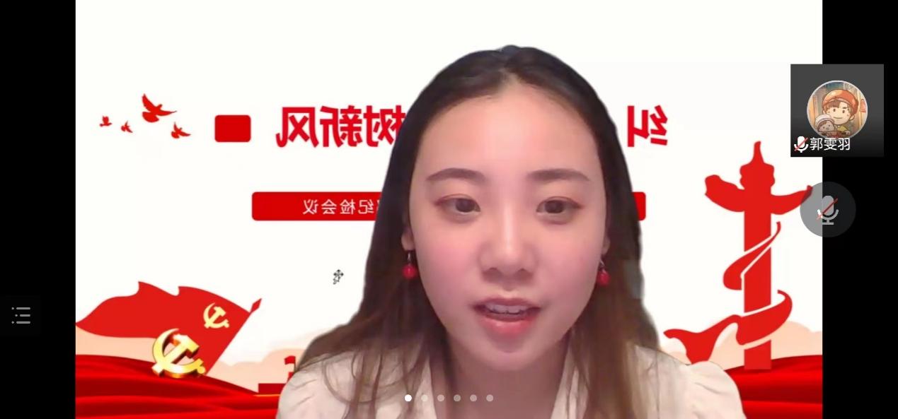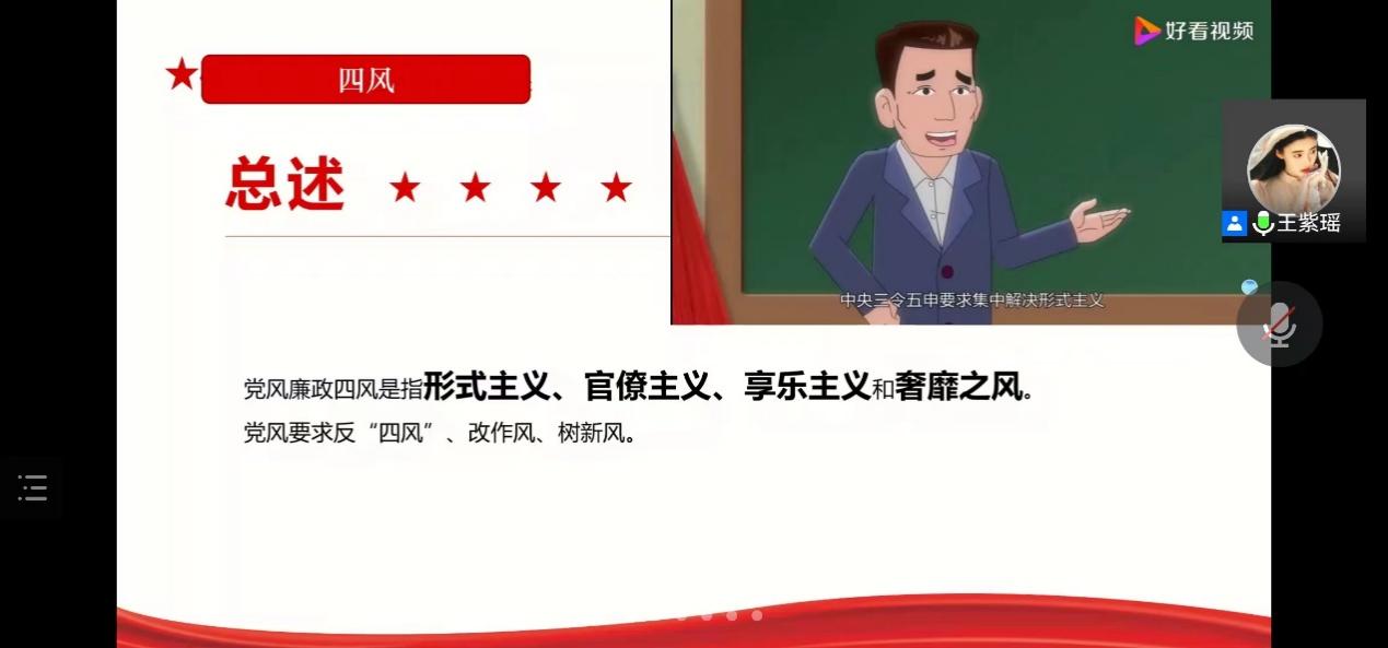 30多位支部党员、入党积极分子在线参会,通过本次学习会增强了支部党员的党性修养和行动自觉。支部组织委员戚珍珍表示,作风建设永远在路上,不能丝毫懈怠,更不能视而不见,作为一名党员,要切实当好纠“四风”的组织者、实践者、推动者和践行者,有效发挥表率作用。支部党员申欣如表示,在学习生活之中,我们一定要坚决纠正“四风”,坚决与坏的作风进行斗争我们只有求真务实,才能融入到大家的心里,才能真正获得大家的点赞张俊表示,作为青年党员,我们要立志做党的光荣传统和优良作风的忠实传人,保持高度警醒,牢守廉洁底线,涵养对道德法纪的敬畏之心,锤炼忠诚干净担当的政治品格,做信念坚定的明白人、规矩人。