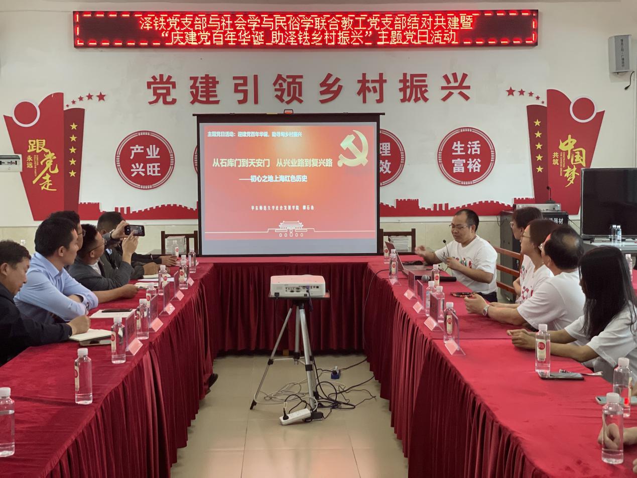 社会学系和民俗学研究所联合教工党支部与泽铁村党支部在泽铁村开展了主题党日活动。活动伊始,全体党员起立,重温入党誓词。“我志愿加入中国共产党,拥护党的纲领,遵守党的章程,履行党员义务,执行党的决定,严守党的纪律,保守党的秘密,对党忠诚,积极工作,为共产主义奋斗终身,随时准备为党和人民牺牲一切,永不叛党。”在庄重而不失温情的氛围中,党史宣讲环节拉开了帷幕。