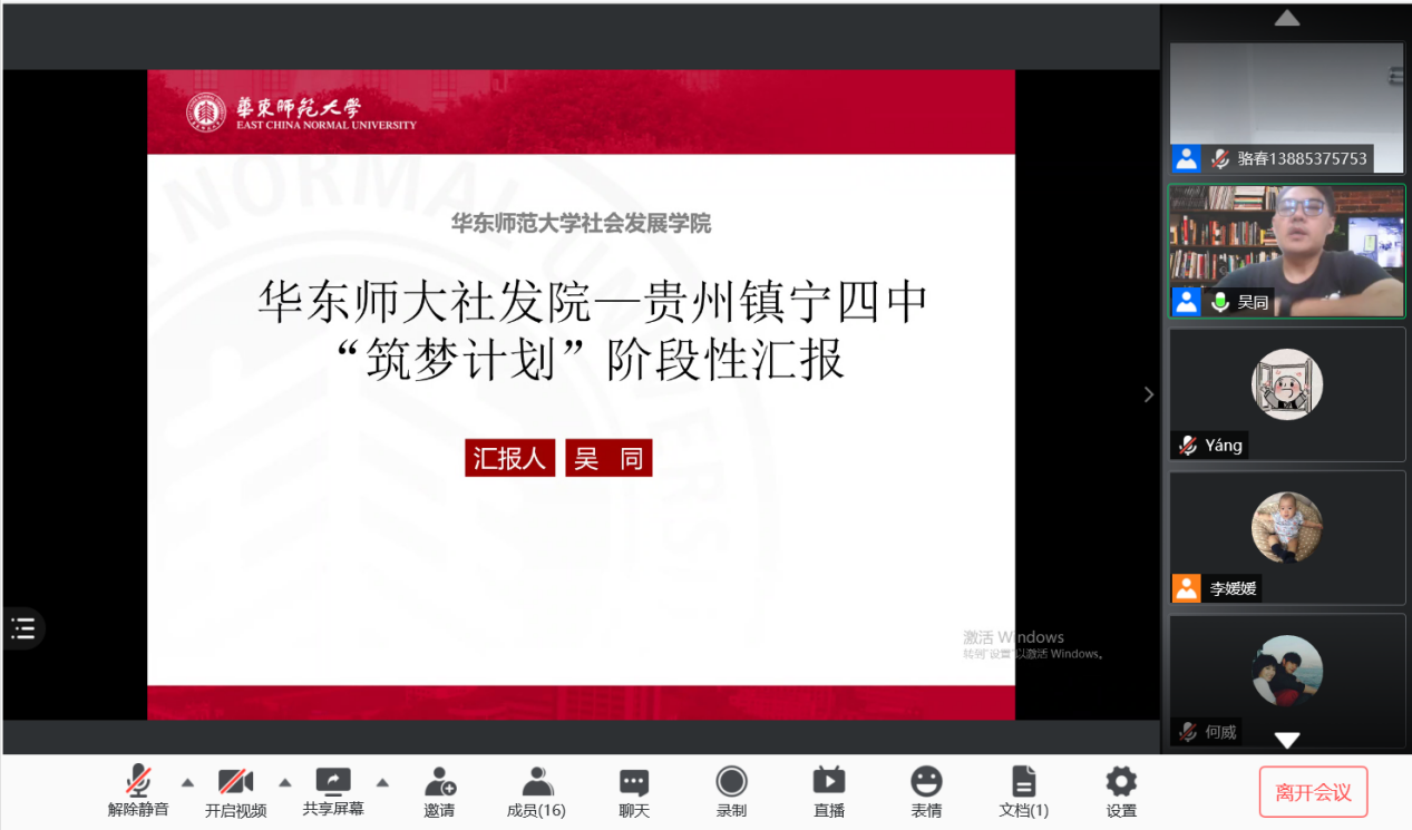 会议伊始,社会工作系和人口学研究所联合教工党支部书记吴同副教授对目前“教育筑梦”计划进行阶段性汇报。吴同老师从五个方面进行总结:一是千里传音,共商筑梦。吴老师从“教育筑梦”的缘起谈起,提到3月第一次线上见面,明确实施计划并达成初步方案。二是实地考察,传经送宝。4月,带队前往镇宁四中实地走访调研,开展关于留守儿童的心理干预的方法讲座,并开展交流座谈,了解需求。三是爱心捐赠,书香传情。由支部购买学习用书和课外阅读用书捐赠给镇宁中学。四是情系留守,爱暖童心。配合支持骆校长开展调研工作,形成完整的调查报告。五是走进师大,教育圆梦。为镇宁四中两位教师申请到教师培训名额,在华东师大接受培训学习。