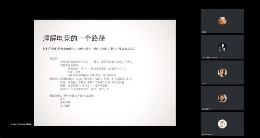 中国社会科学院张劼颖博士以《数字虚拟世界的游乐与生产》为题,从职业化、政府政策到选手,对电竞产业链进行了全方位分析,并提出从生态理论视角理解电竞。中国农业大学丁一帅以《游走“灰色”:游戏代练的数字劳动控制与不稳定性抗争》为题,通过关注代练劳动生产中的“劳动发生学”与压迫和反抗,分析了代练产业的劳动生产现状和矛盾。爱丁堡大学博士研究生王志威报告题目为《“中国人在线”:以互联网为媒介的中国国族认同的话语(再)生产》,采用民族志方法论,综合了“日常国族性”、“国族/民族主义话语”与“‘狂欢节式’的(中文)互联网”三个方面的理论,得出了一定的初步研究发现。宁夏大学硕士研究生史聪玲以《剪纸动画:当代“非遗”传播的一种新媒介》为题,对非遗传播新媒介——剪纸动画进行探究,通过历史梳理和个案分析进行了阐述。禁漫天堂