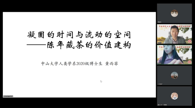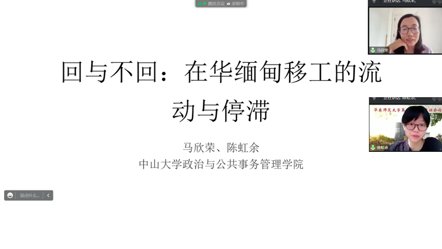 福建江夏学院伍柔静博士报告题目为《如何从文化遗产的视角定义仫佬族的民间传统》,通过爬梳仫佬族依饭节活动的历史与现状,探讨了何为迷信、何为民间传统,以及民间传统的传承与保护问题。中山大学的马欣荣和陈虹余以《回与不回:在华缅甸移工的流动与停滞》为题,聚焦于来华务工的缅甸移工,分析移工在种种结构性限制下,如何在“留”与“回”之间是进行考量并做出相应行动。西南民族大学博士研究生方义勇以《流动中的女性主体性重建》为题,通过对大理集市中来自城市周边村庄的女性流动摊贩的关注,思考移动系统的变化对于当地女性流动方式和特征以及女性主体性的影响。华南理工大学陈惠云研究员的报告题目为《从“附近”返“家”——公共卫生危机下学者的新日常与困境应对》,研究借用“附近”的概念,以交叉学科的视角展现并分析中国社科学者所遭遇的在地困境及应对策略,发现公共卫生危机促使学者们重新发现 “家”作为“原始附近”的价值和重要性。
