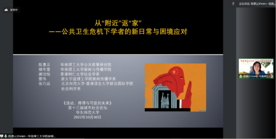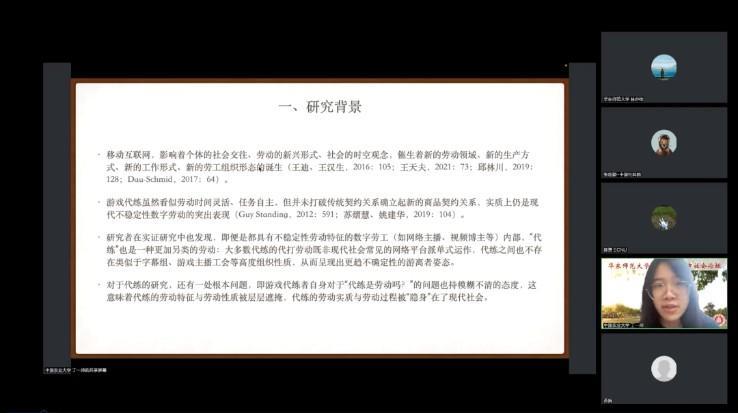 圣安德鲁斯大学杨旸博士以"Arbitrage Labour: the Subjectivity of Transnational Sojourners in Southeast China"为题,基于“套利劳动”(Arbitrage Labour)这一概念,分析了华南地区跨国工作者的主体性,她提出,劳工并非总是作为资本的客体,而是可以通过套利这一实践来获得议价能力,这也是世界范围内新自由主义转型的一部分。上海财经大学博士研究生王慕文以" Informal Employment and Subjective Well-being in Urban China: Do Employment Sector and Working Time Flexibility Matter?"为题,讨论了我国城镇非正规就业和幸福感之间的关系,以及不同的就业部门和工作时间的灵活性在其中发挥的作用。浙江省委党校硕士研究生谭磊以《倦怠与激励:平台企业青年加班现象与情绪劳动》为题,基于情绪劳动理论的分析,从时间、空间、私人生活三个向度讨论了平台企业青年劳工群体的情绪展演机制。