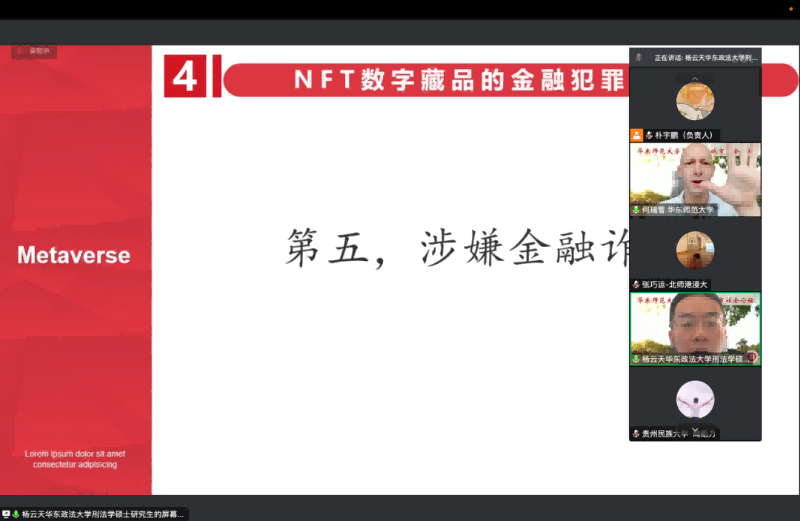 华东政法大学硕士生杨云天以《当代元宇宙概念的金融犯罪风险研究——以NFT数字藏品为例》为题,讨论了在虚拟业务发展的当代,NFT作为元宇宙的科技构成,在经营、销售活动中隐藏的诸种金融犯罪风险。长春理工大学硕士研究生崔颖以《当代社会工作介入 90 后员工离职倾向的研究》为题,从离职年龄、学历、用工形式三个方面分析 90 后员工的离职现状及原因,并从企业社会工作角度给予相关建议。中国农业大学孔锋副教授以"Understanding Catastrophe Risk Prevention in China in the Context of an Interconnected Risk Society"为题进行报告,指出各种类型的接触网络为巨灾风险的跨时空传播提供了多样化的渠道,并在此基础上分析中国综合灾害防御能力的主要特点,从决策者的角度提出化解巨灾风险的关键点。
