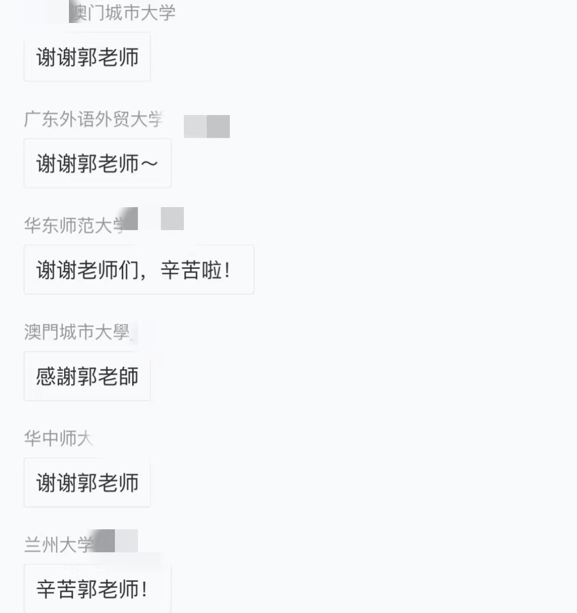 讲座尾声,郭老师与参会师生进行了深入地交流和互动,并就留言区的相关问题给予了详细解答。讲座最后,黄晨熹老师再次向郭老师表达感谢,来自全国各地不同高校的师生以及相关领域工作人员,也纷纷在留言区表达谢意。至此,本场讲座圆满落幕!