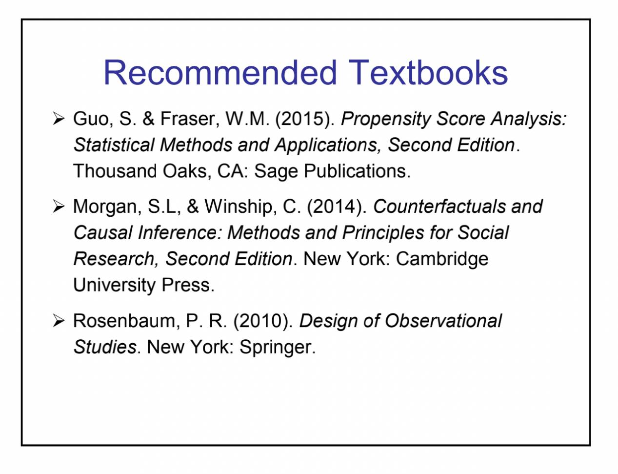 讲座伊始,郭申阳老师简单阐述了本次讲座的内容纲要,并为同学们推荐了相关阅读教材。本次讲座包括观察性研究和挑战、为什么和什么时候需要倾向值分析、内生性问题校正方法的概述以及两个倾向值分析范例,共四部分。
