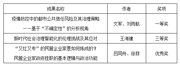 文军、刘雨航撰写的《疫情防控中的都市公共信任风险及其治理策略——基于“不确定性”的分析视角》获一等奖,通信与电子工程学院王海建撰写的《新时代社会治理智能化的伦理挑战及其应对》获三等奖,政治与国际关系学院吕同舟、徐菲撰写的《“又红又专”的民营企业家是如何炼成的?民营企业家政府挂职的基本逻辑与政治功能》获优秀奖