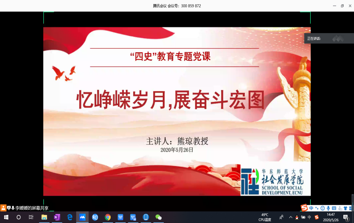 7月1日,时值中国共产党建党九十九周年,社会工作硕士研究生党支部全体党员及入党积极分子共28人依托腾讯会议平台,开展了党史主题学习活动。全体成员共同观看党史故事《一大聚首 共创大业》,一同回顾中国共产党的艰辛发展史。组织委员刘婷同志还带领大家学习毛泽东同志的《为人民服务》,激励支部全体党员同志不忘初心,牢记“为人民服务”。挑选“为人民服务”的主题,意在强调,党员同志应该九九如一,初心不改,牢记党的宗旨。