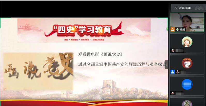 6月21日,社会学硕士研究生党支部通过线上会议召开以“铭记‘四史’,不忘初心,逐梦远航”为主题的党日学习活动。支部书记杨澜带领所有党员一起观看《画说党史》这部微电影,重温中国共产党的辉煌历程与艰辛探索。《画说党史》是由共青团中央出品的“青年学党史”系列作品之一,制作者从数百幅经典之作中精选出66幅大师画作,运用三维技术和影视后期技术,让这些油画动起来,承载着一段一段的历史娓娓“到来”,给人以心灵的震撼!与会党员在认真观看后也纷纷表达了自己的感触,认为青年党员应心怀感恩,砥砺进步,努力用自己的智慧与汗水谱写明日华章。
