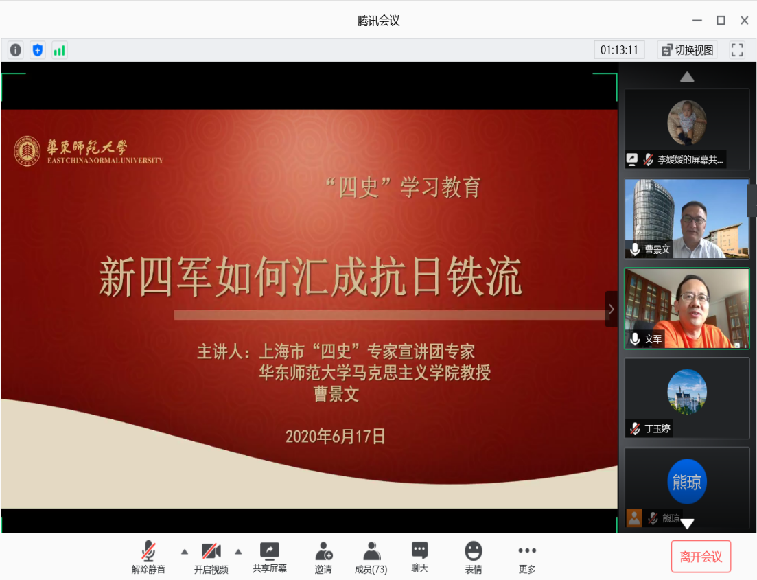 6月17日,学院特邀上海市委“四史”教育宣讲团成员、马克思主义学院中国近现代史纲要教研室主任曹景文教授为学院全体教职工做学习“四史”专题报告会。曹教授结合新四军史实,向与会老师详细阐述了新四军汇成一道抗日铁流的历史过程,呈现了新四军在抗战中不断磨练,不断壮大的艰辛历程,并由此凝聚成听党指挥、坚定信念,坚韧不拔、英勇果敢,顾全大局、相忍为国,内外团结、众志成城,步调一致、纪律严明的“铁军精神”。通过“四史”学习,老师们坚定信念,不忘来路,不断反思,踏浪前行。