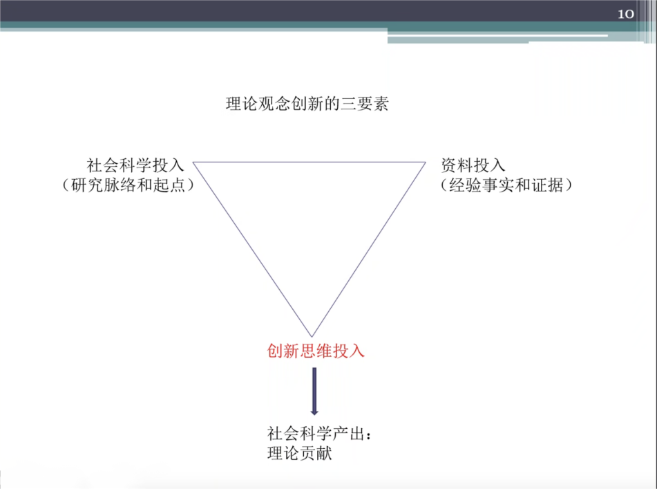对于如何实现理论贡献的问题,王宁老师进一步提出了理论观念创新的三要素及其实践方式:对应存量知识的文献投入,对应经验世界的经验材料投入,以及创新思维的投入。具体来说,在文献投入方面,研究者应当始终在文献阅读过程中寻找理论内部或理论与现实之间的不连贯之处。为此王宁老师介绍了橱柜法、位移法、时距法等多种在文献梳理中获取创新点的方法技巧。在经验资料的有效投入方面,则要求研究者要带有理论的眼光走进现实,关注与现有理论存在张力的经验事实,并系统、全面、深入地收集经验资料。而创新思维的投入则是实现学术研究理论贡献的一项非常重要的条件,需要研究者具备智力、知识、思维方式、性格、动机和环境等资源。