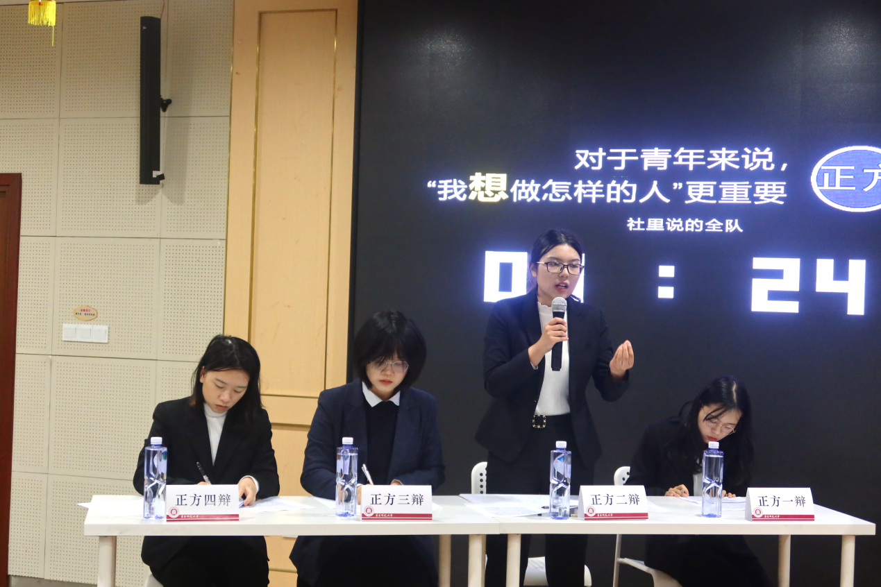 对辩环节让赛况更是达到了空前的激烈,正方两方辩手皆使尽浑身解数,各据一势,不相上下。以“五四青年”与“新中国崛起之路”为论据,我方辩手陈诺围绕辩题进行了精彩绝伦的对辩。我方坚定认为,五四青年之所以做出突出贡献,是因为他们拥有自己的崇高理想,他们知道自己想要什么样的社会。因而新时代青年在追求创新发展的道路上,也需要根据其所想来不断尝试,用正向的目标引导自己的行为。不论是从目标本身的必要性来看,还是从国家对新青年发展的需求上来说,“我想做怎样的人”更具有时代意义与价值。