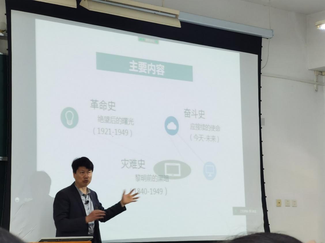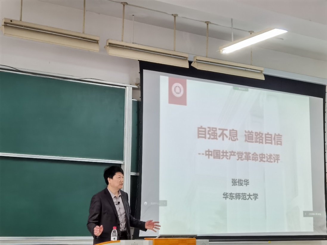 高校思想政治队伍培训研修中心副主任、上海市党建研究会特邀研究员张俊华作辅导报告,题为“自强不息,道路自信——中国共产党革命史述评”。张俊华以“为什么选择社会主义?”这一问题导入,将中国革命党史从灾难史:黎明前的黑暗,革命史:绝望后的曙光,奋斗史:应接续的使命三部分向学员展示中国革命的艰辛历程以及取得的伟大成就,并且从六个方面解读选择中国共产党的历史必然性和其核心地位。