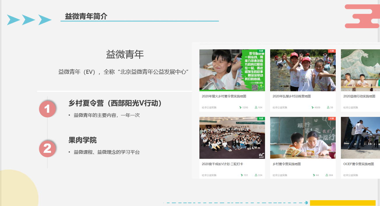 北京大学“益微青年·微光”的高鹏同学分享的题目是“遇见他人,遇见自己”。他详细介绍了北大益微支教团队从组织、建立、规划到实践的整个过程,以及在这个过程中社会组织“益微”给支教队伍在队长集训、课程组长集训、资金支持、财务组长培训、益微理念与方法的学习和队员学校反馈等几个方面提供的全面实用的支持。同时,他也讨论了在整个支教过程中孩子们与队员们的成长和变化:孩子们在学习的过程中逐渐拉近与队员的距离,并且在一定程度上提升了社交能力;队员们也在支教的过程中收获了满满的友谊、团队感,共同构建了一个互信互谅的交流平台。
