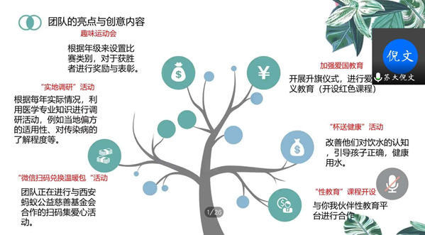 在此次论坛中,团队代表倪文同学从团队目的、活动步骤、团队的亮点与创意内容、团队分工等方面进行了介绍。“医心医意暖基层”关注儿童、关心基层医务人员,也通过“公益地摊”的方式号召苏州爱心人士为山区贫苦留守儿童奉献爱心,也希望调动更多大学生在助力农村教育发展的同时关注农村的贫困问题和医疗困境。