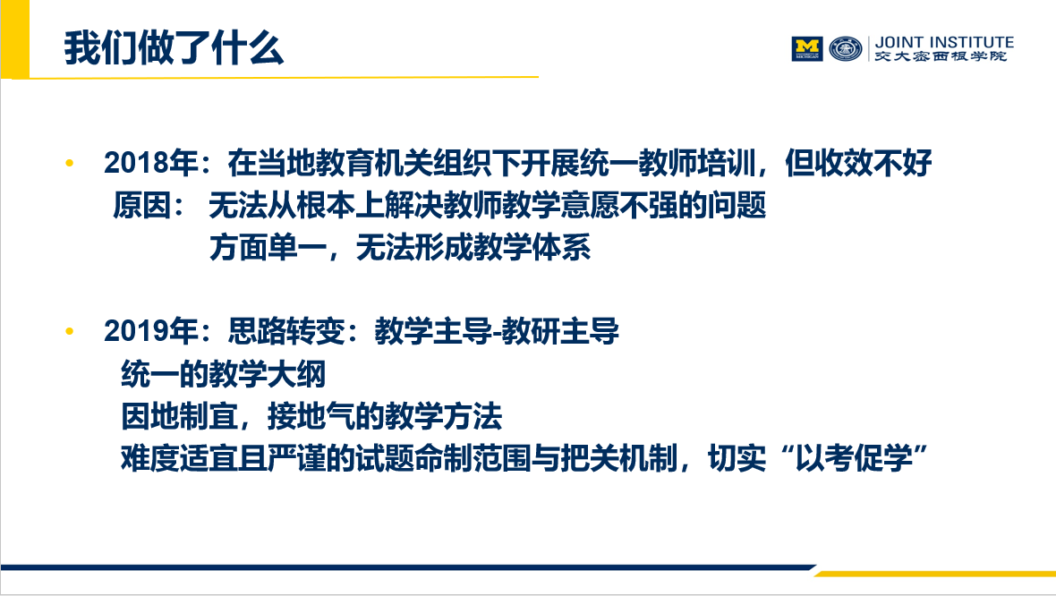 针对这些问题,他们在云南省的洱源县进行了多次尝试。初次开展教师统一培训并未取得预期效果,他们在总结和反思之后进行了全新的尝试——由教学主导转向教研主导,制定统一的教学大纲,因地制宜选择接地气的教学方法,建立难度适宜且严谨的试题命制范围与把关机制,切实“以考促学”。支教思路的改变收获了良好的反馈,也为各位青年学子提供了宝贵的经验。但与此同时,追求卓越的支教团队没有停止反思与回顾,仍然诚实地面对自身的缺陷与不足,希望实现更大的突破。