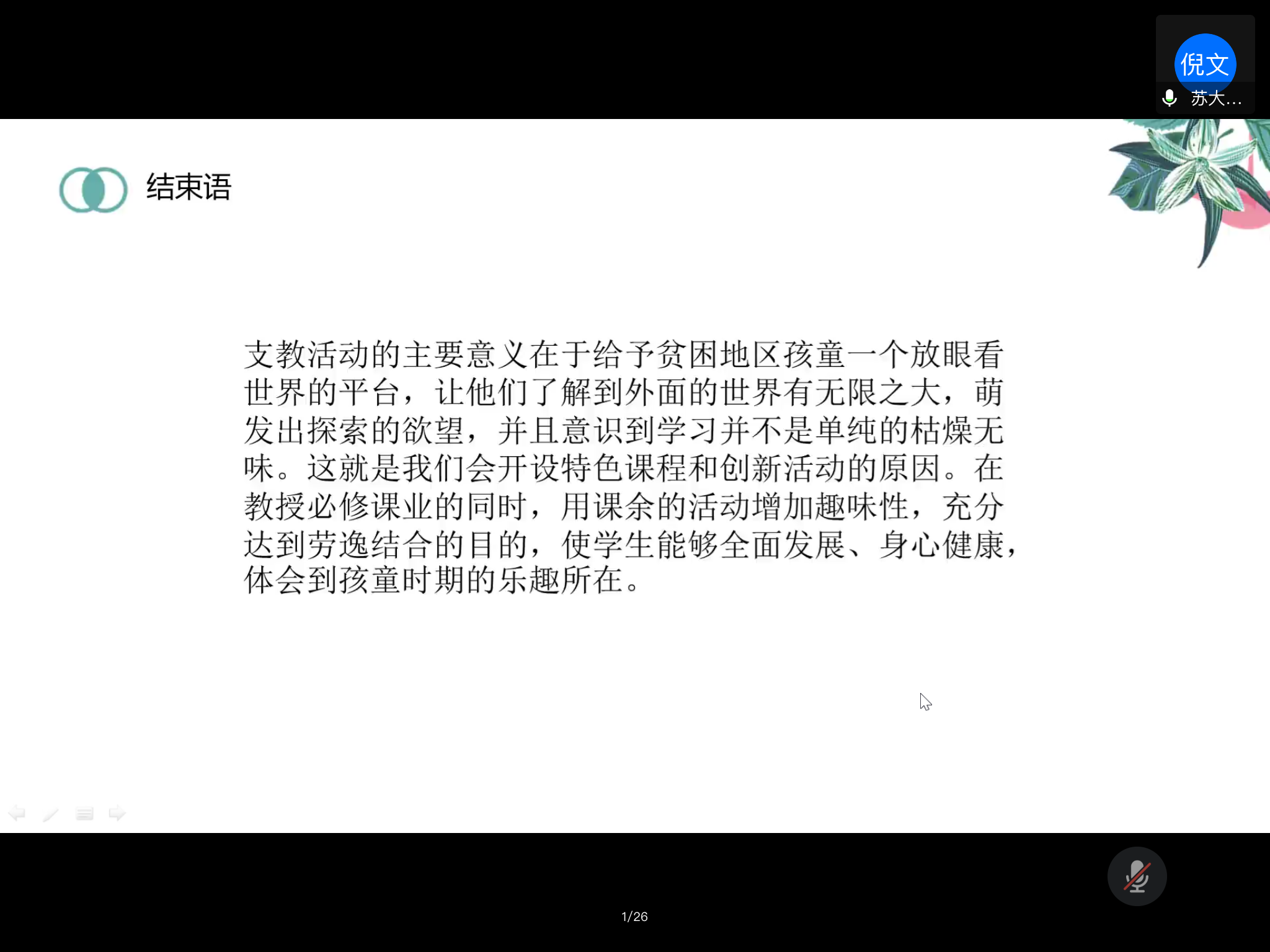 虽然由于时间原因没能进行更多的交流与讨论,但这次活动让我们超越空间限制相聚在此,畅聊青年支教,已使多方收获良多。祝愿各位都能在公益路上不忘初心,继续前进!