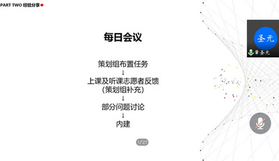在本场论坛中,团队代表章圣元同学在介绍支教团队背景后,重点分享了“支教志愿者的组织与管理”。在支教前的准备阶段,团队通过面试、培训以及教案制作与修改等三个环节培养志愿者的专业素养和团队凝聚力;在助教与听课制度下,团队根据实际要求在每节课中安排2-4名其他志愿者担任助教以辅助教学、维持秩序,并规定志愿者每周旁听三节其他志愿者的课程,反馈听课感想;在每日会议环节中,策划组负责布置相应任务,志愿者则反馈上课心得,共同进行问题讨论。同时,在团建活动中,团队的凝聚力和向心力也到了提升。