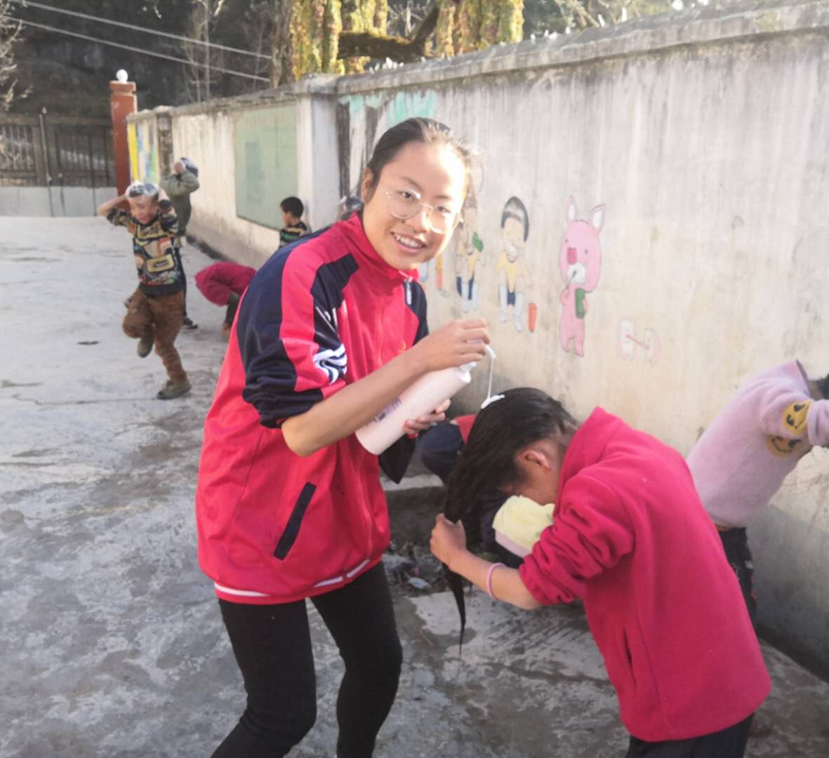 这里的学生基本上都是彝族孩子,大部分人的爸爸在外地打工,妈妈在家照看子女。学生们都住附近的村子里,每天走路来上学,路程最远的,要步行40分钟左右。中午,他们在学校享用免费的“阳光午餐”,支教老师有时候也会集体从山下采购食物,跟孩子们一起分享。山村里的家庭常常没有给孩子刷牙洗头的意识,翁婷婷和其他老师便又担起了“生活老师”的职责,利用午间的休息时间给孩子们洗头。