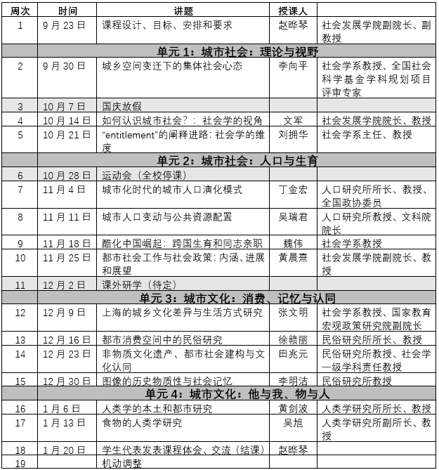 课程内容由四个板块组成,分别是1、城市社会:理论与视野、2、城市社会:人口与生育、3、城市文化:消费、记忆与认同、4、城市文化:他与我、物与人。每个教学板块由3-4位教授进行授课,向同学们讲授本领域内最新的研究前沿。除了强大的教授团队阵容,课程还计划加入课外研学、青年学者互动等环节,以提高同学们的课程自主性,实现课堂讲授与学生实践互动相结合。