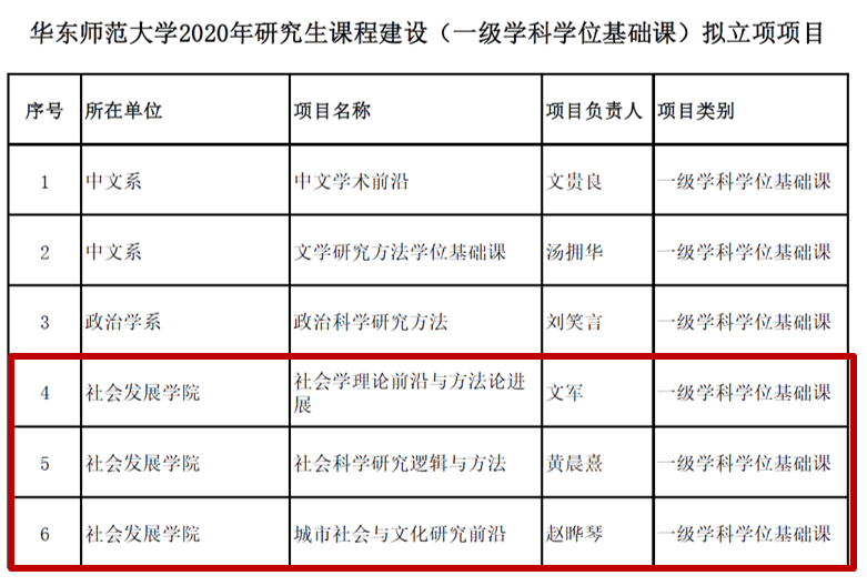 除了《城市社会与文化研究前沿》课程外,我院获得研究生院立项的一级学科学位基础课还包括:《社会科学研究逻辑与方法》(黄晨熹教授领衔,硕士课程)、《社会学理论前沿与方法论进展》(文军教授领衔,博士课程)。三门一级学科学位基础课建设是我院推动研究生培养改革的重要试点。希望通过认真组织、加强指导、做好规划、不断凝练,形成课程特色,提高课程建设成效,为进一步深化研究生课程建设、提升研究生科研能力夯实基础。