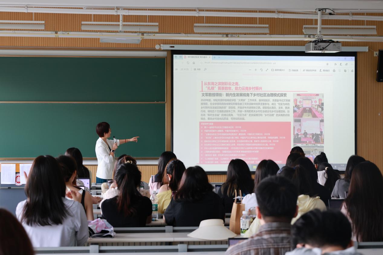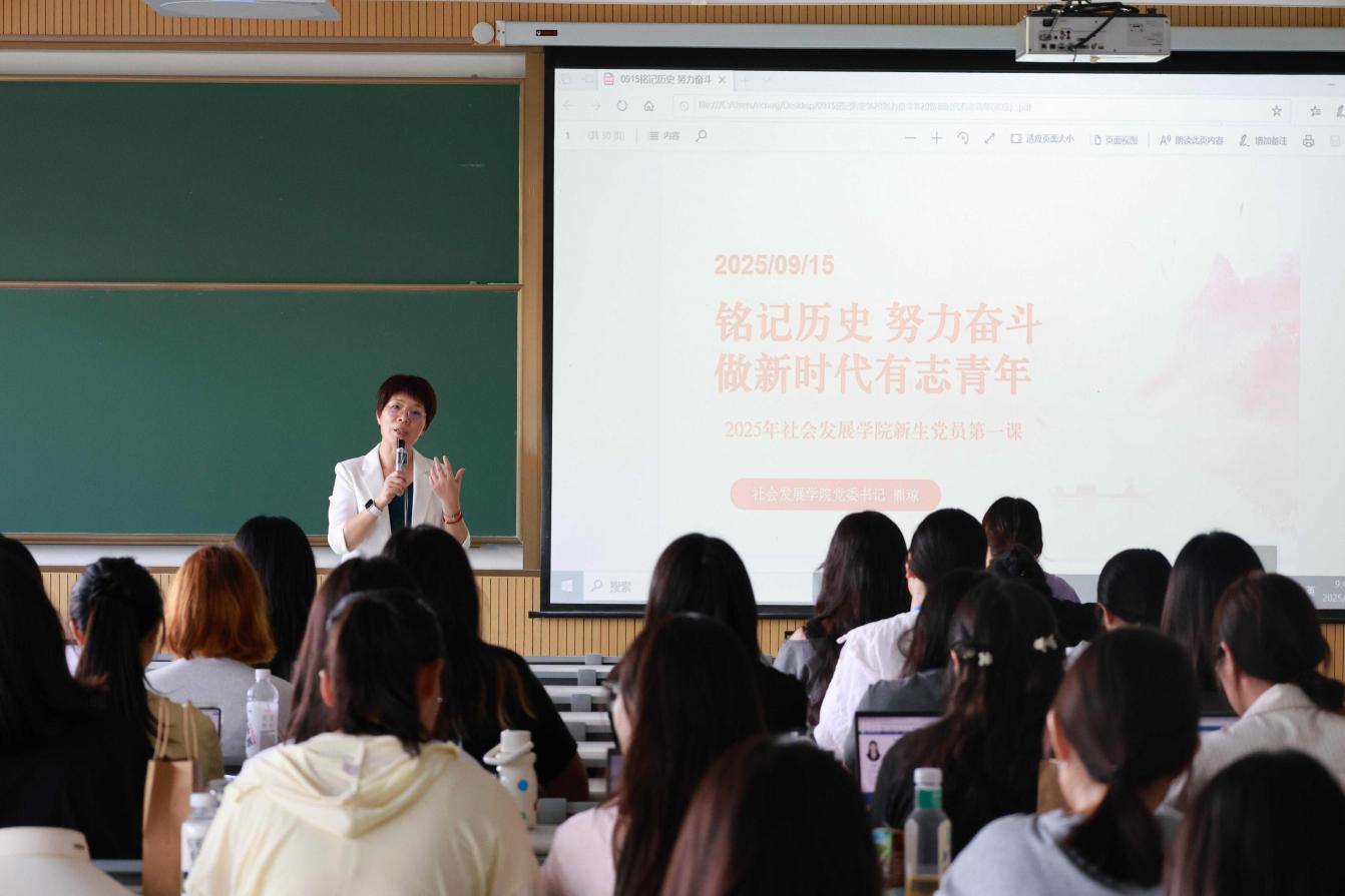 课程伊始,熊琼老师首先对新生党员的到来表示欢迎。熊老师从历史印记、星火燎原、青春奋斗三部分进行了报告。首先,从九三大阅兵的精彩瞬间引入,带领大家一同回顾了中国人民抗日战争的峥嵘岁月和世界反法西斯战争胜利的伟大历程。接下来,熊琼老师系统介绍了学院党委的组织架构与特色工作,涵盖教工党支部、学生党支部的设置情况,以及学院在党建引领下推动学科转型、服务社会等方面的多项实践。她重点回顾了学院在云南寻甸开展的乡村振兴定点帮扶、贵州赤水的志愿服务与产业赋能项目、“美好社区先锋行动”以及基层社区智理等品牌项目,鼓励新生党员积极融入学院党建实践,发挥专业特长,服务社会、锻炼能力。随后,熊老师结合党章条文与具体案例,深入讲解了党员的义务与权利。她强调,履行党员义务是体现责任担当、保持党组织先进性的基础;行使党员权利则须严守党纪、规范言行,始终绷紧“党内”这根弦。她勉励新生党员,当前我们正处在“十五五”规划启航之际,当以史为鉴、奋发有为,将历史的启示转化为矢志奋斗的坚定信念,努力成为肩负民族复兴大任的时代新人,让抗战精神在新时代焕发璀璨光芒。